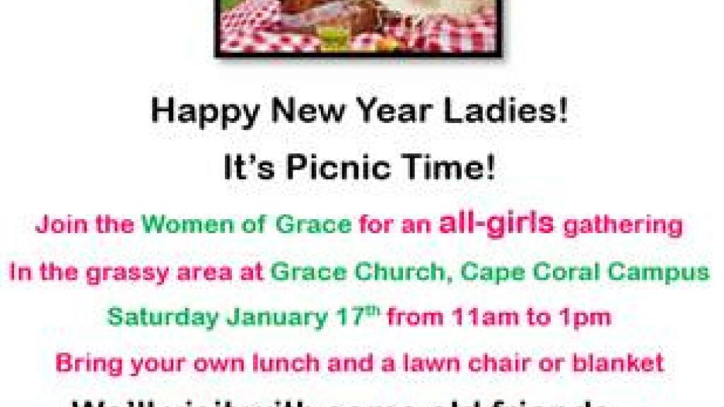 Hey Ladies! Join us for an all-girls gathering in the grassy area of Grace Church's Cape Coral Campus on Saturday, January 17th from 11am-1pm. Bring your own lunch and a lawn...