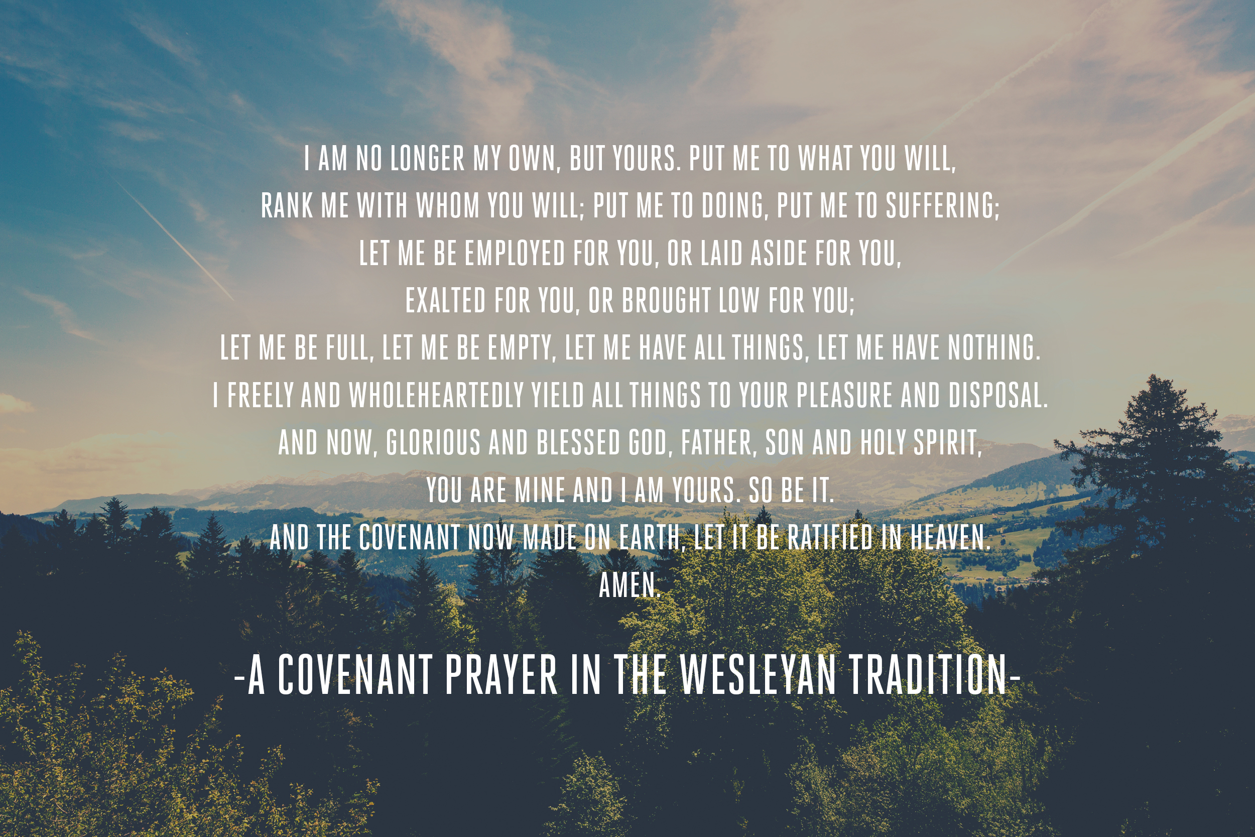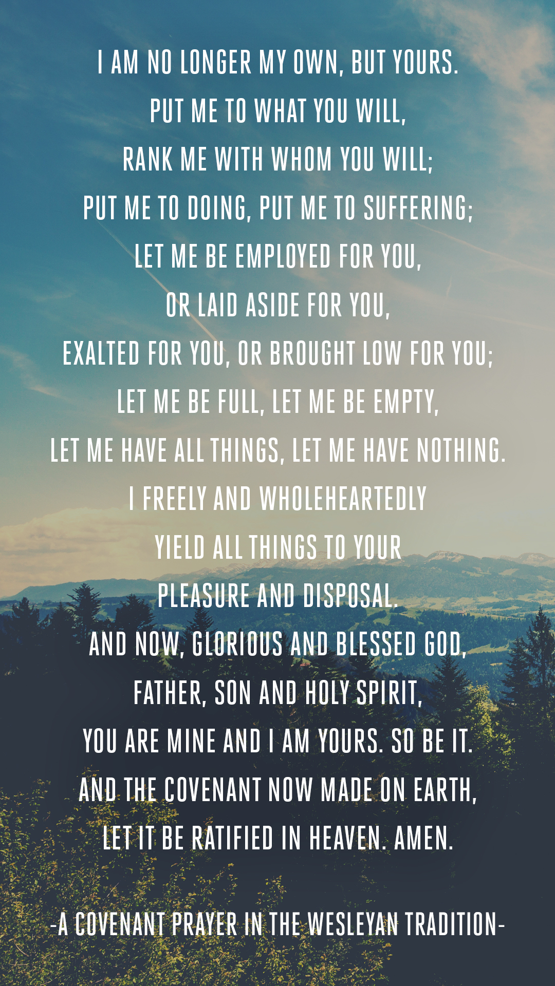 I am no longer my own, but yours. Put me to what you will, rank me with whom you will; put me to doing, put me to suffering; let me be employed for you, or laid aside for you, exalted for you, or brought low for you; let me be full, let me be empty, let me have all things, let me have nothing. I freely and wholeheartedly yield all things to your pleasure and disposal. And now, glorious and blessed God, Father, Son and Holy Spirit, you are mine and I am yours. So be it. And the covenant now made on earth, let it be ratified in heaven. Amen.